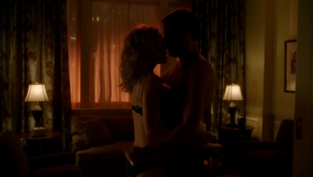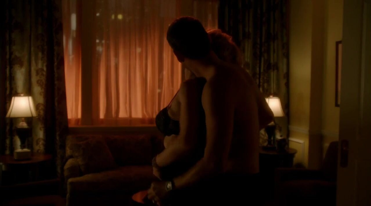 Jeri Ryan having chat with a random guy, and they suddenly went to the hotel room and kissing each other. He kiss her and spin her around and start undressing her black skirt, revealing her black bra and her boobs. She starts kissing her, and her carry her and throws her on the bed. Then he crawls on top of her and opens her black panties and start kissing while having sex